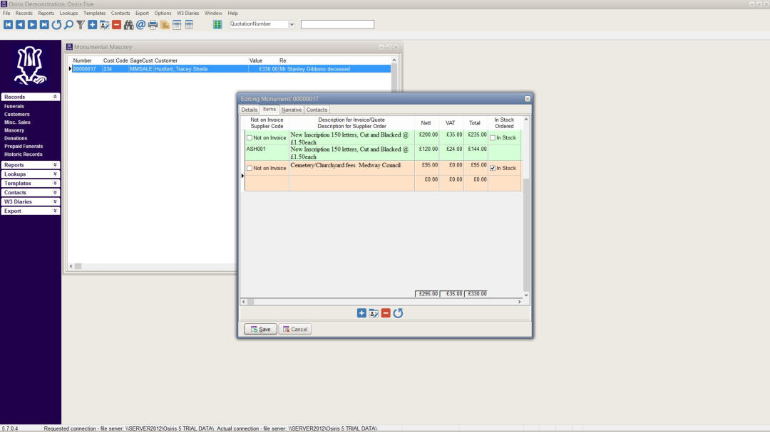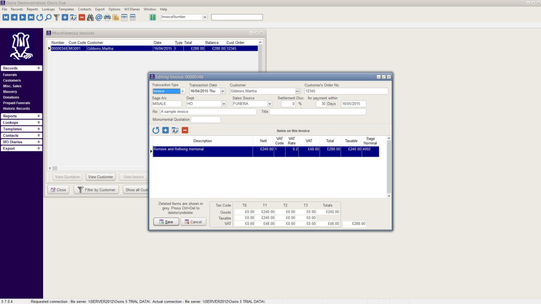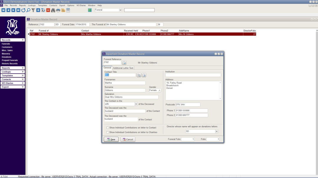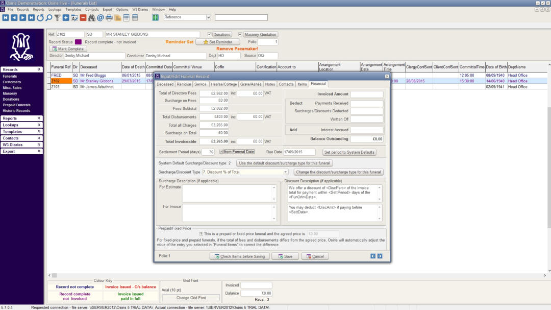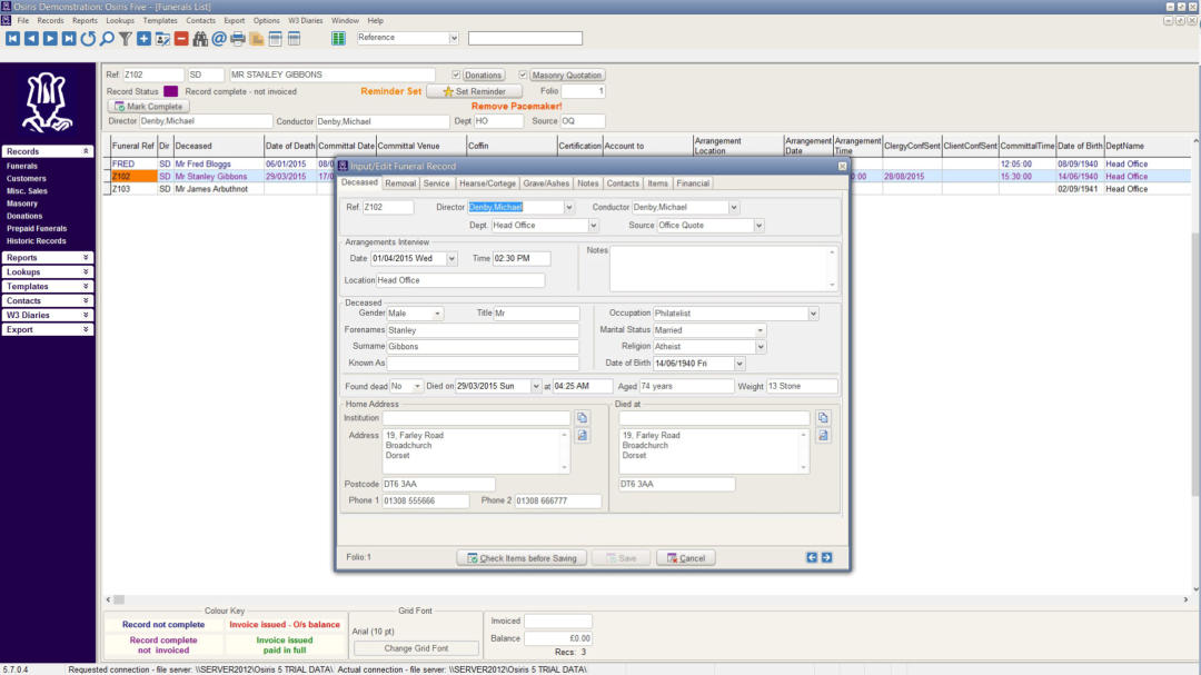 Screen shots from Osiris FMS 5 - Funeral Management System.